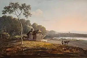 Laporte was born into a family of French Huguenot origins, possibly in London or in Ireland, and studied art under the Irish-born Huguenot painter John Melchior Barralet, either in London or Dublin.[1] He became a drawing-master at the Addiscombe Military Seminary, Surrey. He was also a successful private teacher, and Dr. Thomas Monro (the patron of J M W Turner amongst others), was one of his pupils. From 1785 he contributed landscapes to the Royal Academy and British Institution exhibitions in London, and was an original member of the short-lived society called 'The Associated Artists in Watercolours,' from which he retired in 1811. He also painted in oils.[2]
