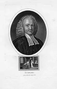 Leland was born in Wigan, Lancashire, on 18 October 1691.[1] He was educated in Dublin, Ireland and went into the ministry there. He was ordained co-pastor to Nathanael Weld (1660–1730) at New Row Presbyterian Church, Dublin, on 16 December 1716.[2] The church moved to Eustace Street, Dublin in 1728. Nathanael Weld's son Isaac (1710-1778), who was named after Nathanael's friend Sir Isaac Newton, was ordained in Eustace Street in 1732 as Leland's colleague. Isaac Weld and Charles Richard Weld, the writers, were the grandsons of the minister Isaac and thus the great-grandsons of Nathanael. Leland received his Doctor of Divinity degree from the University of Aberdeen in 1739.[1] His main interest was in opposing deism. He critiqued proponents of deist ideas, such as Matthew Tindal.[3]
