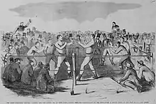 Articles for the fight between Sullivan and Morrissey were signed on September 1, 1853.[10] The stake money was $1,000 a-side and it was specified that the new rules of the London Prize Ring would be applied. Morrissey went into training 2 days after signing the articles, Orville Gardner being selected as his trainer. The fight between Morrissey and Sullivan took place on October 12, 1853, in the hamlet of Boston Corners, which was then in Massachusetts, but out of reach of its authorities, and thus a good location for the illegal match. The fight took place in a field, reportedly viewed by over 3,000 spectators. Sullivan dominated the match for most of the fight, but Morrissey held his own. The fight continued until the 37th round, when a struggle between the fighters on the ropes developed into hostilities between Sullivan and Morrissey's seconds and a "general riot" when elements of the crowd broke into the ring.[10] The referee gave the decision to Morrissey, although it was not clear at the time why he made his verdict. One report said that it was because Sullivan had struck Morrissey with a "foul blow",[10] another stated it was because of a "foul blow" and "not coming to time",[11] whilst another stated that it was because Sullivan had stepped out of the ring before the referee had given his decision.[12] The fight had lasted 55 minutes.[11]