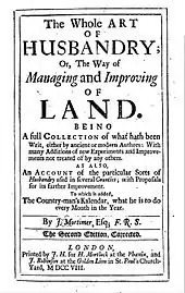 Mortimer's The whole Art of Husbandry, in the way of Managing and Improving of Land forms a landmark in English agricultural literature, and largely influenced husbandry in the 18th century. The writer states that he had read the best books on ancient and modern agriculture, and inspected the practice of the most diligent husbandmen in most countries. After duly digesting these he had added his own experiences.