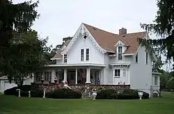 The bay to the right of center contains a tri-sided bay at the first-floor level with multi-paned double-hung sash windows. Above this is a four-over-four double hung sash window within a small gable, breaking the eavesline of the main roof. A similar window is on the second story level of the bay to the left of center. Below, a twentieth-century porch obscures the original first-floor level of the front facade on the left and center bay.[2]