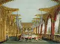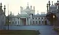 Nash was employed by the Prince from 1815 to develop his Marine Pavilion in Brighton,[54] originally designed by Henry Holland. By 1822 Nash had finished his work on the Marine Pavilion, which was now transformed into the Royal Pavilion. The exterior was based on Mughal architecture, giving the building its exotic form, the Chinoiserie style interiors are largely the work of Frederick Crace.[55]