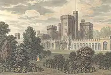 In 1790 Nash met Uvedale Price,[21] whose theories of the Picturesque would have a major future influence on Nash's town planning. In the short term, Price would commission Nash to design Castle House, Aberystwyth (1795). Its plan took the form of a right-angled triangle, with an octagonal tower at each corner,[22] sited on the very edge of the sea. This marked a new and more imaginative approach to design in Nash's work.