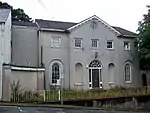 Nash left London in 1784 to live in Carmarthen,[12] to where his mother had retired, her family being from the area. In 1785 he and a local man, Samuel Simon Saxon, re-roofed the town's church for 600 guineas.[12] Nash and Saxon seem to have worked as building contractors and suppliers of building materials.[13] Nash's London buildings had been standard Georgian terraced houses, and it was in Wales that he matured as an architect. His first major work in the area was the first of three prisons he would design, Carmarthen 1789–92.[14] This was planned by the penal reformer John Howard[15] and Nash developed this into the finished building.