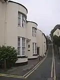 This process would be extended by Nash in planning groups of buildings, the first example being Blaise Hamlet (1810–1811). There a group of nine asymmetrical cottages was laid out around a village green. Nikolaus Pevsner described the hamlet as "the ne plus ultra of the Picturesque movement".[35] The hamlet has also been described as the first fully realized exemplar of the garden suburb.[36] Nash developed the asymmetry of his castles in his Italianate villas. His first such exercise was Cronkhill (1802),[37] and others included Sandridge Park (1805)[38] and Southborough Place, Surbiton(1808).[39]