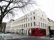 Nash was a vehement advocate of the neoclassical revival endorsed by Soane, although he had lost interest in the plain stone edifices typical of the Georgian style, and instead advocated the use of stucco.[78] Decimus Burton entered the office of Nash in 1815,[79] where he worked alongside Augustus Charles Pugin, who detested the neoclassical style.[80] Decimus established his own architectural practice in 1821.[81] In 1821, Nash invited Decimus to design Cornwall Terrace in Regent's Park, and Decimus was also invited by George Bellas Greenough, a close friend of the Prince Regent, Humphry Davy, and Nash, to design Grove House in Regent's Park.[82]