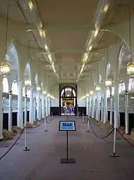 Nash's final home in London was 14 Regent Street which he designed and built 1819–23. Number 16 was built at the same time for the home of Nash's cousin John Edwards,[28] a lawyer who handled all of Nash's legal affairs.[29] Located in lower Regent Street, near Waterloo Place, both houses formed a single design around an open courtyard. Nash's drawing office was on the ground floor and on the first floor was the finest room in the house, the 70-foot-long picture and sculpture gallery; it linked the drawing-room at the front of the building with the dining room at the rear.[30] The house was sold in 1834 and the gallery interior moved to East Cowes Castle.