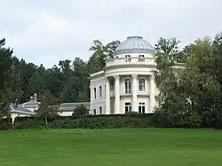 One of Nash's most important developments were a series of medium-sized country houses that he designed in Wales, which developed the villa designs of his teacher Sir Robert Taylor.[12] Most of these villas consist of a roughly square plan with a small entrance hall and a staircase offset in the middle to one side, around which are placed the main rooms. There is then a less prominent servants' quarters in a wing attached to one side of the villa.