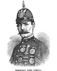 John Nihill (May 25, 1850 May 29, 1908) was an Irish-born soldier in the U.S. Army who served with the 5th U.S. Cavalry during the Indian Wars. A participant in the Apache Wars, he received the Medal of Honor for bravery when he single-handedly fought off four Apache warriors in the Whetstone Mountains of Arizona on July 13, 1872. At the time of his death, he was the only enlisted man to be admitted as a member of the Military Order of the Loyal Legion of the United States.