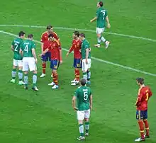 O'Shea was scheduled to face Spain on 11 June 2013 at Yankee Stadium in New York, but was ruled out of the game over the sudden death of his uncle Jimmy O'Leary.[44] On 14 October 2014, on his 100th cap, O'Shea scored the equalising goal with the last kick of the match, in a 1–1 draw against Germany at Gelsenkirchen, in a Euro 2016 qualifier.[45] In the final qualifier, a 2–1 defeat away to Poland on 11 October 2015, he was sent off for a foul on Robert Lewandowski and thus missed the first leg of the Republic's play-off.[46]