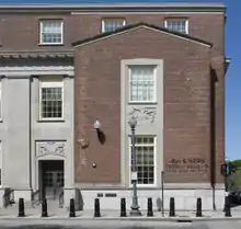 The building's exterior materials are red brick and limestone, with a granite base. A two-story, five-bay limestone frontispiece graces the east facade. A granite balustrade extends between the two entries, while a concrete and granite ramp was added to the south entrance in 1983. Streamlined pilasters are centered between the bays of windows and doors. A simple cornice with square dentils extends along the top of the frontispiece, and is echoed by a streamlined band of limestone along the roof's edge. Bronze-clad double doors are at each entrance. Projecting, gabled brick pavilions are located at either end of the facade. Each has centered windows framed with a limestone surround.