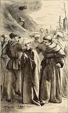 In November 1417 his hiding-place was at last discovered and he was captured by Edward Charleton, 5th Baron Cherleton. Some historians believed he was captured in the upland Olchon Valley of western Herefordshire adjacent to the Black Mountains, Wales, not far from the village of Oldcastle itself in his family's old heartlands. He is said to have been hiding with some Lollard friends at a glade on Pant-mawr farm in Broniarth, Wales, called Cobham's Garden.[7] The principal agents in the capture were four of the tenants of Edward Charleton, 5th Baron Cherleton, two of them being Ieuan and Sir Gruffudd Vychan, sons of Gruffudd ap Ieuan.[8] Oldcastle who was "sore wounded ere he would be taken", was brought to London in a horse-litter. The reward for his capture was awarded to Baron Cherleton, but he died before receiving it, though a portion was paid to his widow in 1422.