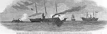Commander Tucker resigned from the U.S. Navy when Virginia seceded from the Union on April 18, 1861, becoming a Commander in the Virginia Navy and, in June, the Confederate States Navy. In 1861–62, he was the commanding officer of CSS Patrick Henry, armed with 10 guns and manned by 150 officers and sailors, participating with her in several combat actions, including supporting the ironclad CSS Virginia in the Battle of Hampton Roads. In April 1862 he took command of the James River Squadron, which included the Patrick Henry and Virginia.[2] During the Federal Navy's attack on the Drewry's Bluff fortifications in May 1862, he commanded one of the defending batteries in the Battle of Drewry's Bluff.[3]