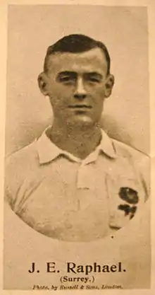 Raphael played his cricket as a specialist batsman and most of his appearances at first-class level were for either Surrey or Oxford University. He also played first-class matches for the Marylebone Cricket Club, Gentlemen of England, London County and an England XI amongst others.[7] Four of Raphael's five centuries were scored for Oxford University, including his career best score of 201 which he made against Yorkshire, who had the bowling of Wilfred Rhodes at their disposal.[8] It remains the only double hundred to be made by an Oxford cricketer against Yorkshire.[9] His only century for Surrey came in the 1904 County Championship, which he captained his county for much of, scoring 111 against Worcestershire.[10] A part-time bowler, his three first-class wickets were of Samuel Coe, Lord Dalmeny and Test cricketer John King.
