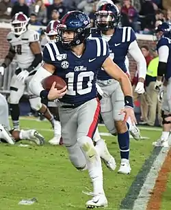 Plumlee began his true freshman season in 2019 as the Rebels' backup quarterback. He made his collegiate debut against California after an injury to starter Matt Corral, completing all seven of his passes for 82 yards and rushing three times for 53 yards as he led the team to a near-comeback win before being stopped at California's one-yard line as time expired.[12] Plumlee made his first career start the following week on September 28, 2019, against Alabama, completing 35.7 percent of his passes for 141 yards with two touchdowns and one interception and also rushing 109 yards and one touchdown in a 59–31 loss.[13] He was named the Southeastern Conference (SEC) Freshman of the Week after rushing for 165 yards and a touchdown with 99 passing yards against Vanderbilt on October 5.[14] On November 10 against New Mexico State, Plumlee broke the freshman rushing yards and rushing touchdown record with 177 yards on the ground and two touchdowns.[15] Plumlee finished the season with 910 yards, four touchdowns and three interceptions on 79-for-150 passing (52.7 percent) while rushing 154 times for 1,023 yards and 12 touchdowns. He set Ole Miss records for rushing yards, rushing touchdowns and total touchdowns by a freshman and the most rushing yards in a season by a quarterback.[16]