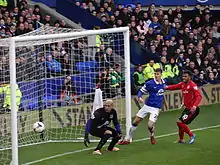 Stones signed a five-and-a-half-year contract with Everton on 31 January 2013,[16] for a transfer fee reported to be in the region of £3 million.[17] He was an unused substitute for three Premier League matches that season, beginning on 10 February in a 2–0 defeat to Manchester United at Old Trafford.[18]