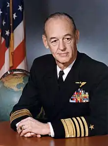Thach was promoted to vice admiral in 1960[5] and served as the Deputy Chief of Naval Operations for Air in the Pentagon,[7] where he presided over development of the A-7 Corsair II, among other naval aviation programs. As Commander in Chief, United States Naval Forces Europe, starting in 1965, he pinned on his fourth star as a full admiral, retiring from the Navy in May 1967 from that position.[8]