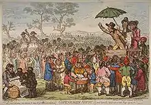 Thelwall's career as an editor and journalist was quite successful, but the highlight of this period was his political activism. In the wake of the French Revolution, he became "intoxicated in the French doctrines of the day".[3] He started to hold talks in London's radical societies and, having made acquaintance with fellow radical John Horne Tooke, contributed to ground the London Corresponding Society in 1792. In 1794 he, Horne Tooke and Thomas Hardy were tried for treason following lectures protesting at the arrest of other political activists. After spending some time at the Tower and at Newgate, the three were acquitted. Government officials who considered him to be the most dangerous man in Britain continued to hound him even after his acquittal. In 1795, after prime minister William Pitt the Younger's Gagging Acts (the Treason Act and Seditious Meetings Act) received Royal Assent, Thelwall's lectures had a shift in theme, from contemporary political comment to the history of Rome to dodge censorship.[4]