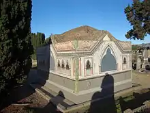 Peacock died on 20 October 1905 at his residence Hawkesbury.[20] He was survived by his second wife and two stepsons.[28] He was interred at Linwood Cemetery on 21 October.[29][30] Peacock's second wife Janey died in 1918, aged 65.[2] The Peacock Mausoleum in the Linwood Cemetery still exists (Block 32 Plot 135–144) but has fallen into dereliction.[31] The mausoleum is boarded up to protect it from weather and vandalism. In 2012, the plywood was painted by artist and Linwood Cemetery Trustee Anne Holloway with paint donated by Dulux for community projects. The mural was officially unveiled on 26 May 2012.[32]