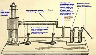- In the lab he came up with the following simple way to obtain "optically pure" air, i.e. air that has no visible signs of particulate matter. He built a square wooden box with a couple of glass windows on it. Before closing the box, he coated the inside walls and floor of the box with glycerin, which is a sticky syrup. He found that after a few days' wait the air inside the box was entirely particulate-free when examined with strong light beams through the glass windows. The various floating-matter particulates had all ended up getting stuck to the walls or settling on the sticky floor.[33] Now, in the optically pure air there were no signs of any "germs", i.e. no signs of floating micro-organisms. Tyndall sterilised some meat-broths by simply boiling them, and then compared what happened when he let these meat-broths sit in the optically pure air, and in ordinary air. The broths sitting in the optically pure air remained "sweet" (as he said) to smell and taste after many months of sitting, while the ones in ordinary air started to become putrid after a few days. This demonstration extended Louis Pasteur's earlier demonstrations that the presence of micro-organisms is a precondition for biomass decomposition. However, the next year (1876) Tyndall failed to consistently reproduce the result. Some of his supposedly heat-sterilized broths rotted in the optically pure air. From this Tyndall was led to find viable bacterial spores (endospores) in supposedly heat-sterilized broths. He discovered the broths had been contaminated with dry bacterial spores from hay in the lab. All bacteria are killed by simple boiling, except that bacteria have a spore form that can survive boiling, he correctly contended, citing research by Ferdinand Cohn. Tyndall found a way to eradicate the bacterial spores that came to be known as "Tyndallization". Tyndallization historically was the earliest known effective way to destroy bacterial spores. At the time, it affirmed the "germ theory" against a number of critics whose experimental results had been defective from the same cause. During the mid-1870s Pasteur and Tyndall were in frequent communication.[34][35]