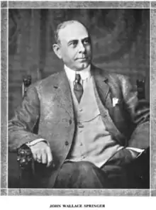 John Wallace Springer, born in Jacksonville, Illinois on July 16, 1859, was the son of Sarah Henderson and John Thomas Springer, who was a banker and an attorney.[1] A War Democrat, he was a member of the legislature and supported Abraham Lincoln.[2] John's mother Sarah Henderson Springer was from one of the distinguished families of Kentucky. His uncle William McKendree Springer was an Illinois legislator and judge in Washington, D.C. on the United States court of appeals. He was raised in Jacksonville, Illinois.[1]