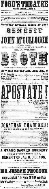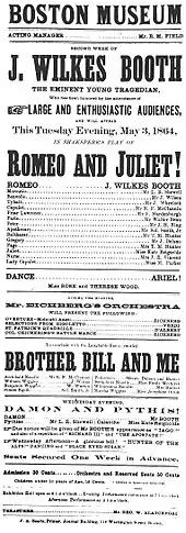 On November 25, 1864, Booth performed for the only time with his brothers Edwin and Junius in a single engagement production of Julius Caesar at the Winter Garden Theatre in New York.[57] He played Mark Antony and his brother Edwin had the larger role of Brutus in a performance acclaimed as "the greatest theatrical event in New York history."[56] The proceeds went towards a statue of William Shakespeare for Central Park, which still stands today (2019).[57][58] In January 1865, he acted in Shakespeare's Romeo and Juliet in Washington, again garnering rave reviews. The National Intelligencer called Booth's Romeo "the most satisfactory of all renderings of that fine character," especially praising the death scene.[59] Booth made the final appearance of his acting career at Ford's on March 18, 1865, when he again played Duke Pescara in The Apostate.[60][61]