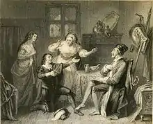 Wright painted domestic and sentimental subjects in the style then popular, and also historical compositions, notable for their detailed depictions of costumes; the plays of Shakespeare were a frequent source of inspiration.[3] Engravings of his pictures featured in publications such as "The Keepsake", "The Literary Souvenir", and Heath's "Book of Beauty",[4] "The Drawing-room Scrap Book", and "The Female Characters of Shakespeare".[5] His portraits of Lord Tenterden, Bishop Gray, and Bishop Marsh were engraved for Fisher's "National Portrait Gallery".[1]