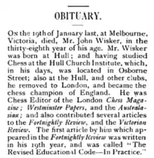 John Wisker (30 May 1846 in Kingston upon Hull, England – 18 January 1884 in Richmond, Victoria) was an English chess player and journalist. By 1870, he was one of the world's ten best chess players, and the second-best English-born player, behind only Joseph Henry Blackburne.[1]