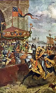 At a banquet in Edinburgh and presumably after too much alcohol he issued, as Champion of England, the following challenge to David Lindsay (later 1st Earl of Crawford): "Let words have no place; if ye know not the Chivalry and Valiant deeds of Englishmen; appoint me a day and a place where ye list, and ye shall have experience".[1] As a result of the challenge, on St George’s Day, 23 April 1390,[3] he fought David Lindsay in mock combat on horseback on London Bridge, losing the match by falling from his horse in their third charge against each other.