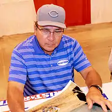 Born and raised in Oklahoma, Bench is one-eighth Choctaw; he played baseball and basketball and was class valedictorian at Binger-Oney High School in Binger.[12] His father told him that the fastest route to becoming a major leaguer was as a catcher. As a 17-year-old, Bench was selected 36th overall by the Cincinnati Reds in the second round of the 1965 amateur draft, playing for the minor-league Buffalo Bisons in the 1966 and 1967 seasons. During the 1967 season, he hit a grand slam against Jim Palmer, who would go on to never allow a grand slam in 19 years in the major leagues.[13][14] Bench was called up to the Reds in August 1967.[15] He hit only .163, but impressed many people with his defense and strong throwing arm, among them Hall of Famer Ted Williams. Williams signed a baseball for him and predicted that the young catcher would be a "Hall of Famer for sure!"[6][16] Williams' prophecy became fact 22 years later in 1989 when Bench was elected to Cooperstown.