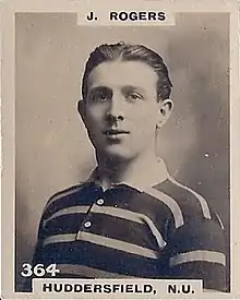 John Henry Rogers (1 October 1892[6] – 26 July 1958[7]) was a Welsh rugby union and professional rugby league footballer who played in the 1900s, 1910s and 1920s. He played club level rugby union (RU) for Bridgend RFC and Cardiff RFC,[1][2] initially as a wing, i.e. number 11 or 14, and later as a scrum-half (alongside Clem Lewis), i.e. number 9, and representative level rugby league (RL) for Great Britain, Wales and Other Nationalities, and at club level for Huddersfield and Wakefield Trinity (Heritage No. 313), as a wing, stand-off, or scrum-half, i.e. number 2 or 5, 6, or 7.[3][8][4]