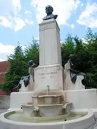 Apparent also in the literature of the times was opposition, and support for, the various other ways he expressed opposition to the racial practices that were beginning to emerge, and re-emerge as well, in the city of Baltimore, the state of Maryland, the nation, and in the posthumously constructed and founded institutions that would carry his name.[26] A Baltimore American journalist praised Hopkins for founding three institutions, a university, a hospital, and an orphan asylum, specifically for colored children, adding that Hopkins was a "man (beyond his times) who knew no race" citing his provisions for both blacks and whites in the plans for his hospital. The reporter also pointed to similarities between Benjamin Franklin's and Johns Hopkins' views on hospital care and construction, such as their shared interest in free hospitals and the availability of emergency services without prejudice. This article, first published in 1870, also accompanied Hopkins' obituary in the Baltimore American as a tribute in 1873. Cited in many of the newspaper articles on him during his lifetime and immediately after his death were his provisions of scholarships for the poor, and quality health services for the under-served without regard to their age, sex, or color, the colored children asylum and other orphanages, and the mentally ill and convalescents.