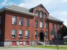 The Johnson School is located on the north side of School Street, occupying the entire block between Williams and Cady Streets in the city's Amity Square neighborhood.[2] It is a two-story brick building, with a hip roof and granite foundation, with red sandstone trim elements. The roof is pierced on three sides by gabled center sections, that on the southern side, over the main entrance, more prominent than the others. The main facade is nine bays wide, the central three (below the gable) slightly recessed. Windows in the outer bays are set in segmented-arch openings, with sandstone sills and brick lintels with slightly projecting keystones. Windows in the central section are set in square openings with stone lintels and sills, except in the gable, where there are three windows set in round-arch openings. The main entrance is recessed in a round-arch opening with brick pilasters at the corners. The interior of the school retains significant original finishes.[3]