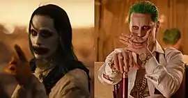 Jared Leto's interpretation of the Joker as seen in Suicide Squad polarized critics and fans. His performance was described as "scene-stealing", yet "wasted" due to his limited screen time.[24][25] Adding to this was that while Leto's iteration of the character was considered intriguing, the film seemingly omitted significant footage that would have fleshed out his character.[26] Christopher Orr of The Atlantic described Leto's performance as "Ledger-Lite" and a "super-cameo", unfavorably comparing this iteration to Jack Nicholson and Heath Ledger's previous portrayals.[8] According to Billy Givens of We Got This Covered, some fans disliked the character's re-imagining as a "psychotic romantic more concerned with being cool than with sowing his usual chaos" who had ditched the "flamboyant clothing that's become synonymous with the villain for a noir-style gangster aesthetic full of hokey face tattoos and a grill."[17] However, Mark Hamill, who voiced the Joker in various DC projects, said that he "loved" Leto's take on the character, commenting that each interpretation of the Joker should be different depending on the tale being told.[27]