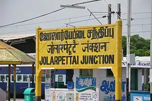 Jolarpettai Junction[1] is located in the Tirupattur district of Tamil Nadu, India. Jolarpettai Junction railway falls within Chennai Central- Bangalore City LineVia Bangarapet, Krishnarajapuram and Jolarpettai–Shoranur line leading to Kerala trunk via Salem Jn, Erode Jn, Coimbatore Jn, Palakkad Jn and hence connect Chennai to Mangalore through ShoranurJn, Kozhikode and Kannur. Chennai to Thiruvananthapuram through Thrissur, Ernakulam Jn and Kollam Jn .[2]