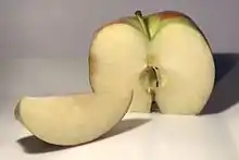 Jonagold /ˈdʒɒnəˌɡoʊld/ is a cultivar of apple which was developed in 1953 in New York State Agricultural Experiment Station of Cornell University's College of Agriculture and Life Sciences, a cross between the crisp Golden Delicious and the blush-crimson Jonathan; the name Jonagold is a portmanteau of these two variety names. They form a large sweet fruit with a thin skin. Because of their large size they are now favoured by commercial growers in many parts of the world. Jonagold is triploid, with sterile pollen, and as such, requires a second type of apple for pollen and is incapable of pollenizing other cultivars. The Jonagored Apple, a sport mutation of Jonagold, was once covered under United States Patent PP05937,[1] now expired.