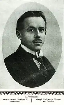 Jonas Aukštuolis (1 February [O.S. 20 January] 1885 – 28 October 1949) was a Lithuanian diplomat. During World War I, he worked for the Lithuanian Society for the Relief of War Sufferers and was sent to Stockholm to organize contacts with German-occupied Lithuania. He was the Lithuanian representative in Sweden and Norway (1919–1922), Netherlands (1921–1922), Latvia (1923–1927), Estonia (1923–1930), Finland (1929–1934), Czechoslovakia (1932–1934), Argentina, Uruguay, and Brazil (1934–1939).[1] In 1939, he was recalled to Kaunas and was deported by the Soviets to a Gulag camp in June 1941. He died in one of the camps in Mordovia.
