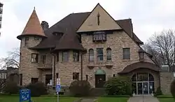 Jonas M. Kilmer House, also known as Temple Concord, is a historic home located at Binghamton in Broome County, New York. It was constructed in 1898 and is a large 3+1⁄2-story residence using an eclectic Victorian-era vocabulary. It is primarily constructed of stone and features irregular form and massing. The building is characterized by a variety of different sized gables and turrets, all surmounted by a high hipped roof clad in asbestos shingles. Jonas M. Kilmer (1843–1912) was the father of Willis Sharpe Kilmer (1869–1940).[2]