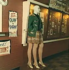 Displayed outside the entrance to the museum were many old pictures of sideshow freaks and human oddities. The Okeh Laughing Record, a 1923 recording of a man and woman laughing while a musician plays a funereal trumpet solo, played in a continuous loop along with a recording of Jones as a sideshow barker, enticing people to enter.[5]
