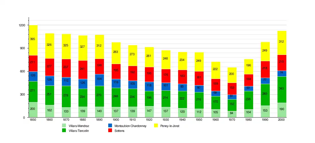 The municipalities of Villars-Tiercelin, Montaubion-Chardonney, Sottens, Villars-Mendraz and Peney-le-Jorat merged on 1 July 2011 into the new municipality of Jorat-Menthue.[3]
