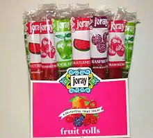 Joray Fruit Rolls are an apricot-based fruit snack produced by Joseph Shalhoub & Son, Inc, founded 1886 by George Shalhoub after immigrating from Lebanon. Joray Fruit Rolls were developed by Louis Shalhoub in the 1970s and have been produced in New York City since then. The fruit roll is actually derivative of the Lebanese confection, amardeen, a thick paste made from dried apricots. To this day, dried apricots are the predominant ingredient in all of the Joray fruit roll ups, and apricot is Joray's most popular flavor. Made from real fruit, these fruit leather products are fat-free and kosher.