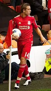On 9 June 2011, Henderson was transferred to Liverpool for an undisclosed fee thought to be between £16 and £20 million.[23][24][25][26] He made his debut in Liverpool's first match of the 2011–12 Premier League, a 1–1 draw against his former club Sunderland where he was given a mixed reception by Sunderland fans.[27] On 27 August 2011, Henderson scored his first goal for Liverpool in a Premier League fixture at Anfield against Bolton Wanderers.[28] On 26 February 2012, Henderson started on the right of midfield in Liverpool's 2012 League Cup Final victory over Cardiff City before being substituted in the 58th minute.[29] On 5 May, he played the full 90 minutes as Liverpool were beaten 2–1 by Chelsea in the 2012 FA Cup Final.[30] Henderson ended the 2011–12 season with 2 goals from 48 appearances.[31]
