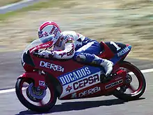 Jorge Martínez Salvadores, nicknamed "Aspar", (born 29 August 1962) is a Spanish former professional motorcycle racer and racing team manager. He competed in the Grand Prix road racing world championships from 1982 to 1997.[1] After retiring from active competition, Martínez became a successful motorcycle racing team owner. He is one of the most successful motorcycle racers in Grand Prix motorcycle racing history with 22 Grand Prix victories to his name in the 80 cc class and a further 15 wins in the 125 cc class.[1] In 2019, Martínez was inducted into the MotoGP Hall of Fame.[2]