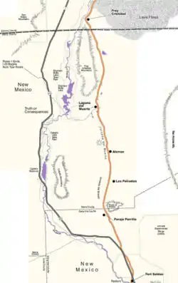 The Jornada del Muerto trail was that part of the Camino Real which when traveling northward departed from the Rio Grande from the Paraje de Robledo, later the site of Fort Selden, just north of Las Cruces, New Mexico. It passed northward up through a gap, between the Selden Hills on the west and Doña Ana Mountains to the east, on to the plain of the Jornada. The last opportunity for filling water barrels and watering stock before passing farther north was from the Paraje de San Diego overlooking the Rio Grande five leagues beyond Robledo and a half league from the River.[6]:May 12,and Itinerary May 12
