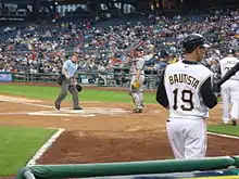 Bautista played in 11 games for the Pirates in 2005.[16] In 2006, his first full season in the major leagues, Bautista hit .235 with 16 home runs (HR) and 51 runs batted in (RBI).[16] The following season in 2007, he posted similar numbers in 142 games, finishing the season with a batting average of .254, 15 home runs and 63 RBI.[16] That same year, he became the starting third baseman for the Pirates. He took over for reigning National League batting champion Freddy Sanchez, who moved to second base.