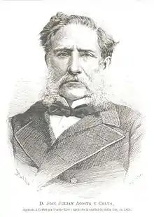 José Julián Acosta Calbo[note 1] was born in San Juan, Puerto Rico to Francisco de Acosta y Sandoval and Juana Antonia Calbo y Garriga. There he received his primary education. He was one of Rafael Cordero's most notable students. Cordero was an inspiration to Acosta and the influence of his teachings remained with Acosta for the rest of his life. Later, he became a protégé of Father Rufo Manuel Fernández, who would send him to Madrid, Spain to study Physics and Mathematics. After he graduated in 1851, Acosta continued to expand his educational knowledge in Paris, London, and Berlin. In Berlin, he was a student of the naturalist Alexander von Humboldt.[1][2][3] When Acosta returned to Puerto Rico, he took a job as a professor of Botany and Maritime Sciences and became the director of the Civil Institute of Secondary Education. Acosta was the founder and editor of the newspaper El Progreso (Progress), and he collaborated with many other newspapers which were oriented toward liberalism.[1]