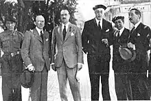Don Javier considered Lamamié fully loyal and authorized him to enter ruling bodies of the unificated state party,[207] but he preferred to tone down his political engagements. Instead, he resumed activity in agricultural organisations, in particular Confederación Nacional Católico Agraria, which he still presided. Because of its acronymic name CNCA, Lamamié and other of its top lobbyists were named "sansidrinos".[208] Already in June 1937 they staged a grand Asamblea Cerealista in Valladolid;[209] Lamamié was confirmed in presidency of CNCA and president of one of its components, Confederación Católico Agraria. Relations with the emerging Francoist regime remained correct; the traditional confederative structure was affiliated within the newly established national syndicalist Servicio Nacional de Trigo and both organizations declared total mutual understanding.[210] In late 1937 Lamamié personally obtained some unspecified contracts in the Salamanca province[211] and in March 1938 the Interior decree nominated him governor of the Burgos-based Banco de Crédito Local de España,[212] a bank entrusted with financial aid to municipalities taken over from the Republicans.[213]