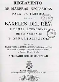 Cover of the Reglamento de maderas necesarias para la fábrica de los baxeles del Rey by Romero Landa (1783).