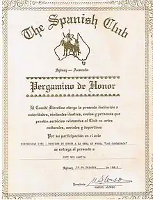 In October 1975, José won the 'Concurso Literario En Prosa' (Literary Competition in Prose) Carta De España, Hogar Español in Melbourne, Australia. In 1984 he won the prestigious Cervantes award and was awarded the 'Pergamino De Honor' (Parchment of Honour) following a Spanish literature competition in Sydney, Australia.