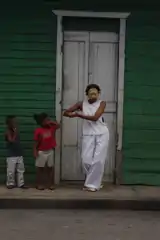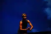 The word 'dominicanish' is used to describe her experience because, as a result of her migration, she is not only dominican.[15] It deals with issues of migration and absorption of new cultures. Even her use of combining english and Spanish is an example of her being in-between two cultures.[16] As she retells her experience of learning english, she moves her mouth and body in unique ways, while her feet remain still. This shows how American society is trying to force her to assimilate into their culture and her resistance to doing so.[17] Baez draws heavily from her own experiences as an immigrant from the Dominican Republic. Being a Dominican immigrant, Baez possesses multiple identities.[18] In Dominicanish, her identity is defined as always being in motion. She is constantly moving between cultures or physically between two countries.[19] This motion is expressed through her body movement as she is performing. The play is published slightly different throughout its editions since the state of the dominican immigrant is not static.[15] In her performance of Dominicanish, she uses examples of daily activities as ways to resist a culture that is trying to erase her colored body.[20] The one-woman play is directed by Claudio Mir and was accompanied by trumpet music by Ross Huff.